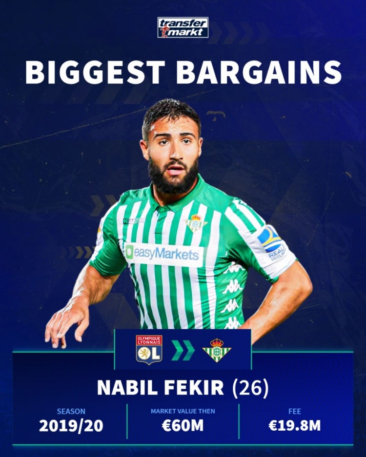 费基尔(里昂→贝蒂斯):那时身价6000万欧,转会费1980万欧