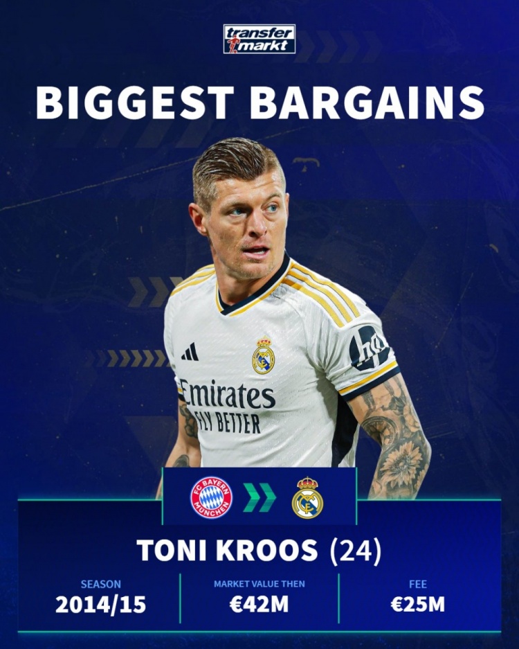 克罗斯(拜仁→皇马):那时身价4200万欧,转会费2500万欧