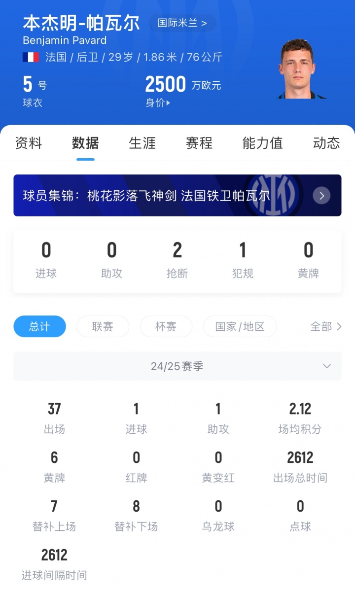 帕瓦尔现年29岁,2023年夏窗3140万欧元从拜仁加友邦米,范畴当今共为国米出场70次,他的德回身价为2500万欧元。
