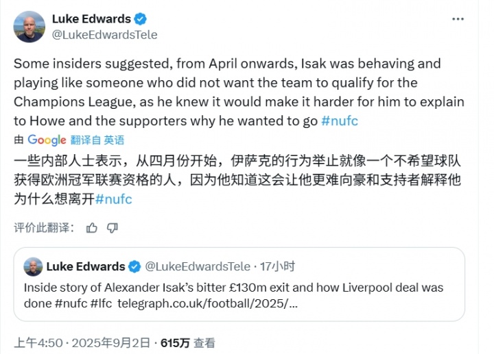 这家英国宇宙性报纸被觉得是逐日电讯报,逐日电讯报今夏抓续报说念伊萨克转会闹剧的纽卡跟队Luke Edwards今晨发帖暗示,伊萨克从四月份起就进展得像不但愿球队赢得欧冠履历雷同。