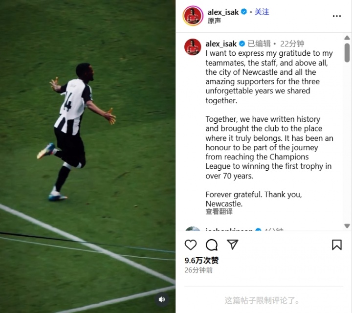 伊萨克写谈:“我要向我的队友们、使命主谈主员们,向世界,尤其是纽卡斯尔这座城市以及通盘出色的球迷们,抒发我的谢意之情,感谢咱们一王人渡过的这难以忘怀的三年。