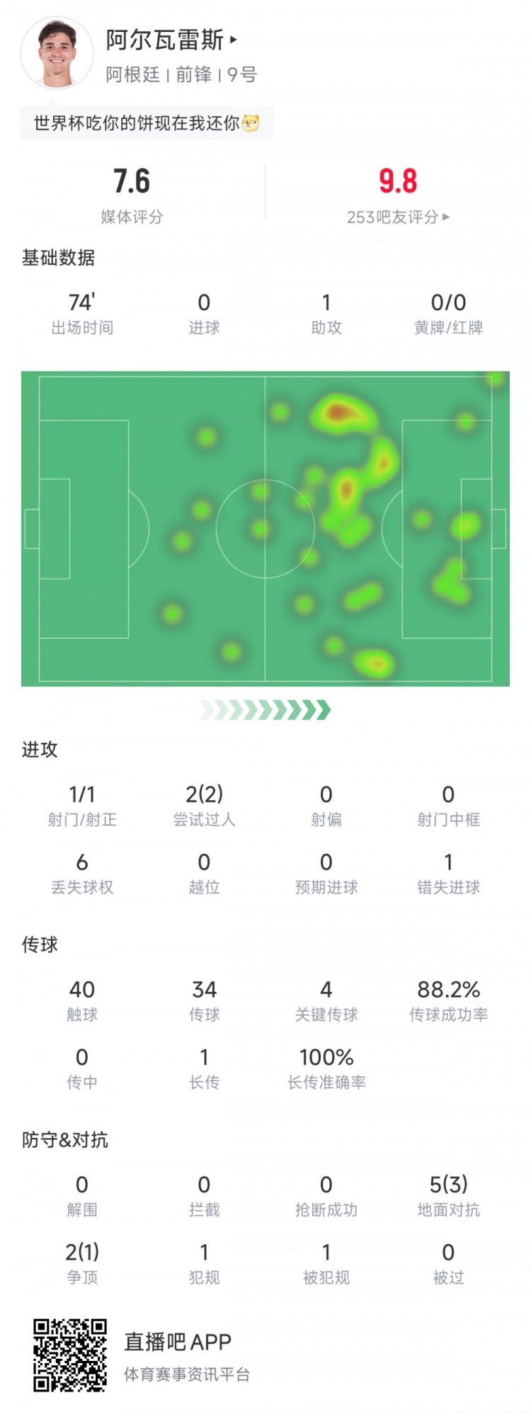 本场比赛,阿尔瓦雷斯出战74分钟,1次射门1次射正,送出1次助攻,2次过东谈主,错失1粒进球,4次要道传球,传球得手率88.2%,5次大地顽抗3次得手,2次争顶1次得手。